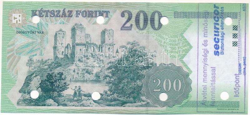 Beschreibung: 2004. 200Ft "FB 5464849" hibásnak feltüntetett bankjegy, lyukasztásokkal, áthúzással és hamis "Securicor" bélyegzővel T:AU