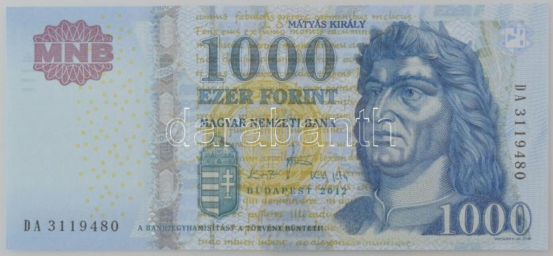 2012. 1000Ft "DA 3119480" T:UNC https://www.darabanth.com/de/469-Fernauktion/469.0/Numismatik/Ungarische-Banknoten~2000008/2012-1000Ft-DA-3119480-TUNC~II3175562
