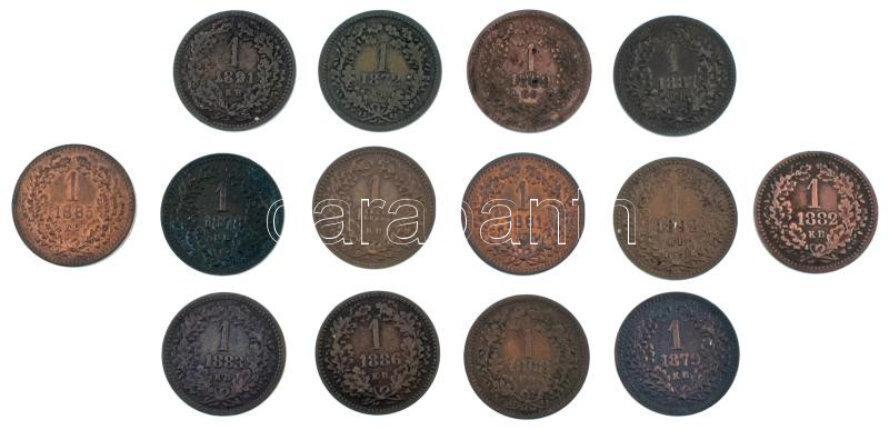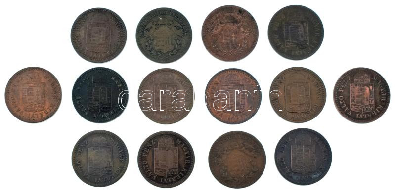 1868KB-1892KB 1Kr Cu (14xklf) a névérték közel teljes körmöcbányai veretének gyűjteménye (1873KB hiányzik)! Többségében szép állapotban T:AU-VF néhány darabon patina / Hungary 1868KB-1892KB 1 Kreuzer Cu (14xdiff) almost complete collection of the denomination from the Kremnica mint (without the 1873KB)! Mostly in particularly fine condition. C:AU-VF some coins with patina