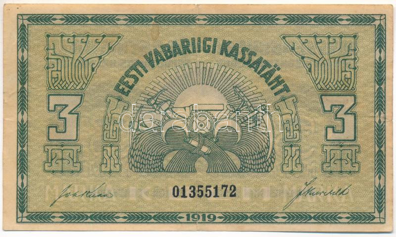 Estonia 1919. 3 Marka... https://www.darabanth.com/de/469-Fernauktion/469.0/Numismatik/Weltweit-Banknoten~2000015/Esztorszag-1919-3M-TF-apro-szakadas-kis-folt-Estonia-1919-3-Marka-CF-tiny-tear-small-spot~II3148166