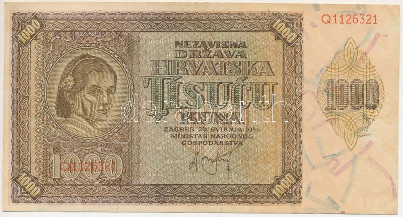 Independent State of Croatia 1941. 1000 Kuna "Q" C:F fine paper