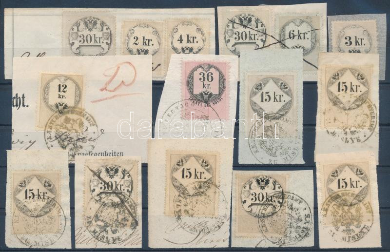 Beschreibung: 12 db kivágás régi okmánybélyegekkel