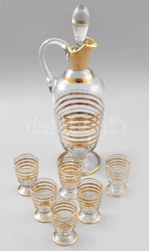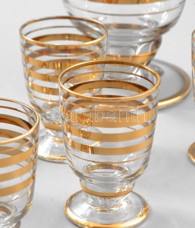 Beschreibung: Régi aranycsíkozott italos készlet, talpas dugós üveggel, hibátlan, m: 35 cm, poharak m: 7 cm