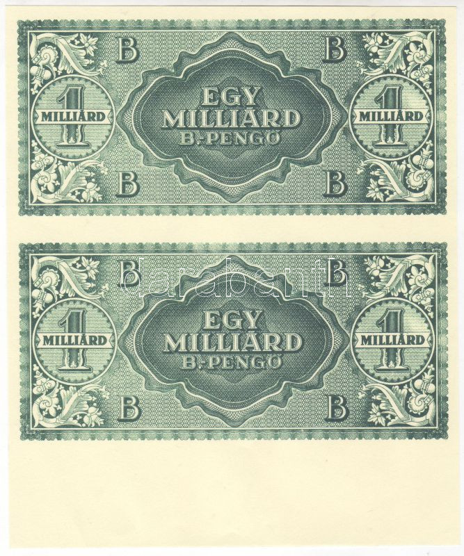 1946. 1000.000.000B.-pengő "zöld" csak hátoldali nyomat párban, alsó í... https://www.darabanth.com/de/47-Fernauktion/47.0/Numismatik/~171/1946-1000000000B-pengo-zold-csak-hatoldali-nyomat-parban-also-ivszellel-TI-RR~II94674