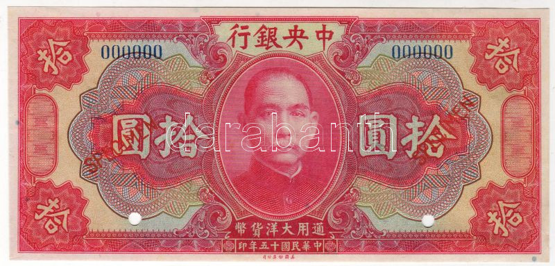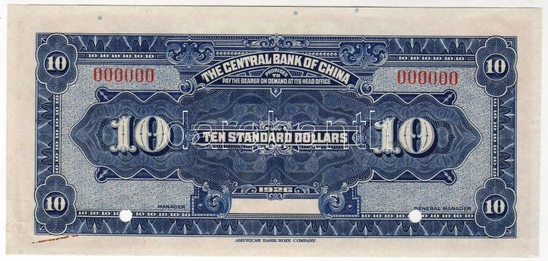 Beschreibung: Kína/Central Bank 1926. 10$ Minta "00" T:I