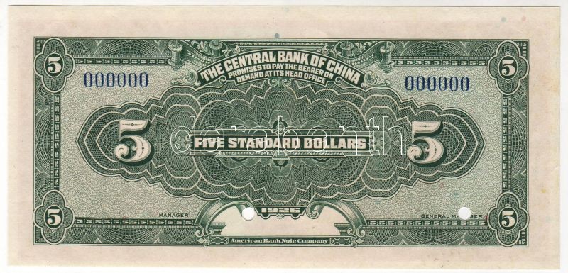 Beschreibung: Kína/Central Bank 1926. 5$ Minta "00" T:I