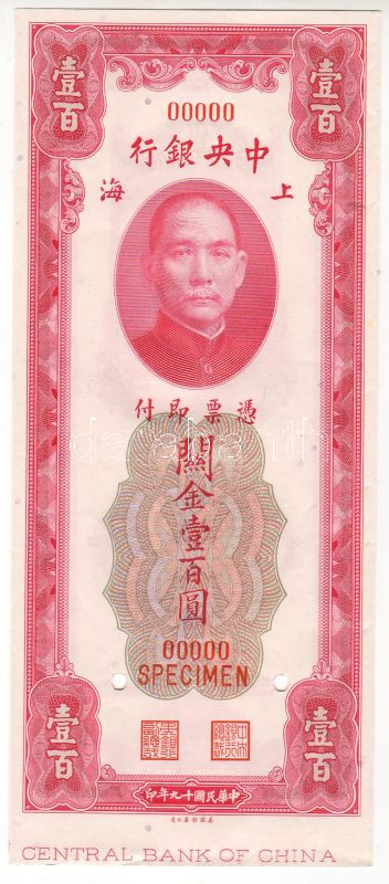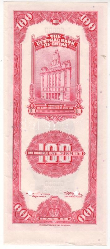 Kína/Central Bank 1930. 100Y Specimen "000" T:II- https://www.darabanth.com/de/47-Fernauktion/47.0/Numismatik/~171/KinaCentral-Bank-1930-100Y-Specimen-000-TII-~II94422