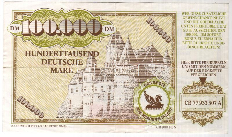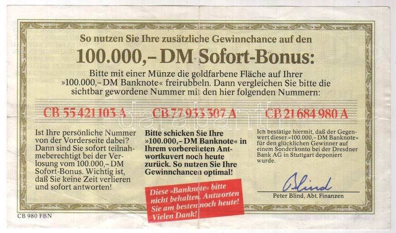 Beschreibung: Németország modern pénzformájú - 100.000DM hirdetés T:2