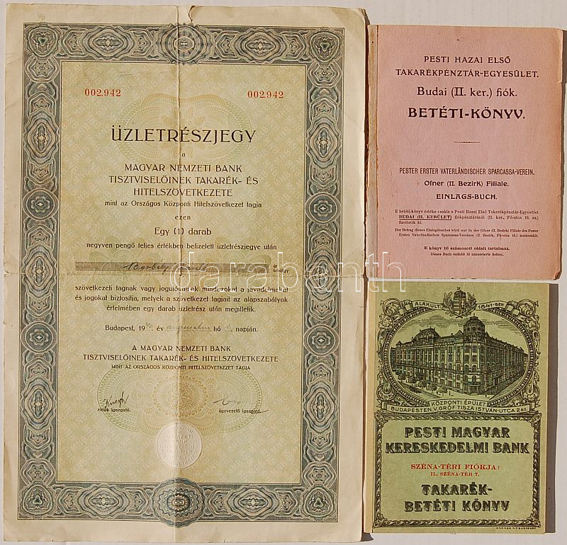 Beschreibung: 1930-40. 2 db takarékbetétkönyv + "MNB Hitelszövetkezeti" 40P névértékű üzletrészjegy