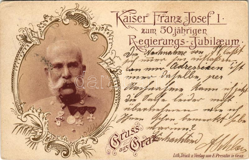 1898 (Vorläufer) Gruss aus Graz! Kaiser Franz Josef I. zum 50 jährigen Regierungs-Jubilaeum. E. Presuhn / Ferenc József uralkodásának 50. évfordulója / Franz Joseph's 50th anniversary of reign. Art Nouveau, floral (EK)