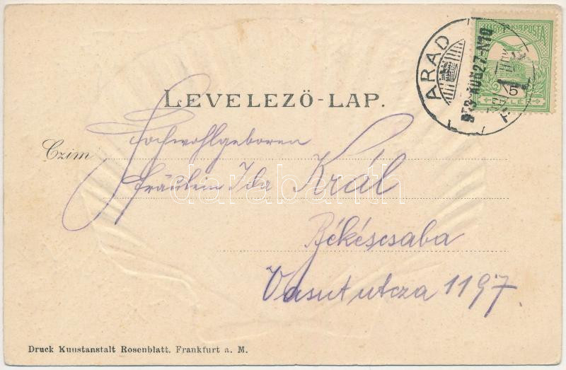 Beschreibung: Arad, Marosparti részlet evezősökkel. Kerpel Izsó kiadása, kagylós montázs, dombornyomott szecessziós litho / Mures riverside with rowers. Druck Kunstanstalt Rosenblatt Art Nouveau shell montage, Emb. litho (EK)