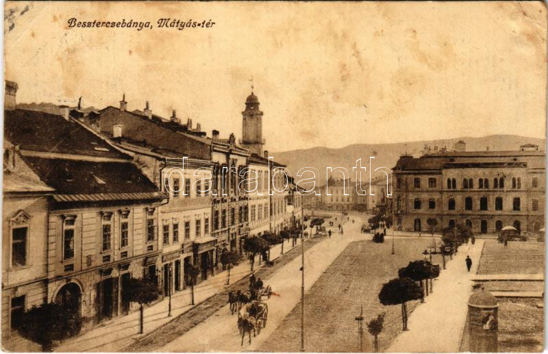 Beschreibung: 1917 Besztercebánya, Banská Bystrica; Mátyás tér, üzletek. Havelka József kiadása / square, shops (fl)