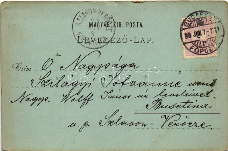 Beschreibung: 1898 (Vorläufer) Budapest XIV. Ős-Budavár, Kimenet este. Edgar Schmidt 375. (kis szakadás / small tear)