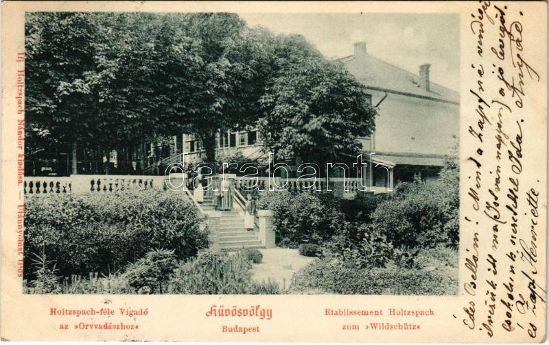 1900 Budapest II. Hűvösvölgy, Holtzspach-féle Vigadó az Orvvadászhoz. ... https://www.darabanth.com/de/470-Fernauktion/470.0/Ansichtskarten/Ungarn~2000005/1900-Budapest-II-Huvosvolgy-Holtzspach-fele-Vigado-az-Orvvadaszhoz-Ifj-Holtzspach-Nandor-kiadasa~II3165293