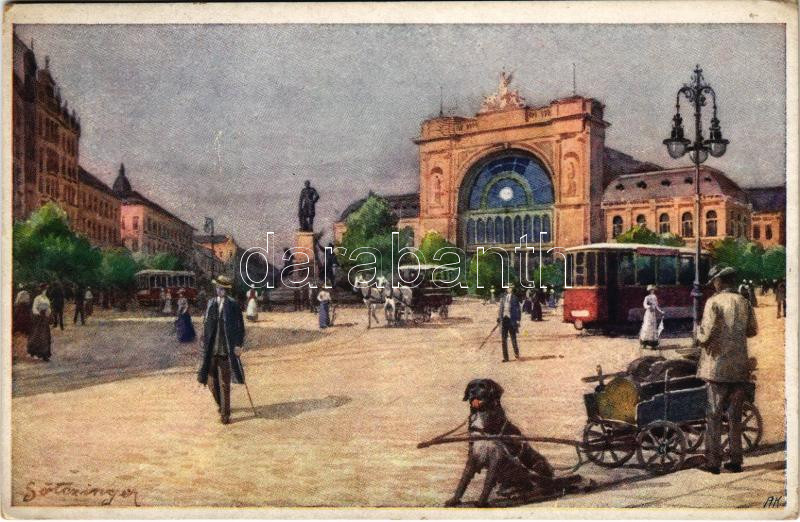 Beschreibung: Budapest VII. Keleti pályaudvar, vasútállomás, villamos, omnibusz, Baross szobor. B.K.W.I. S. 280/9. s: Götczinger (fl)