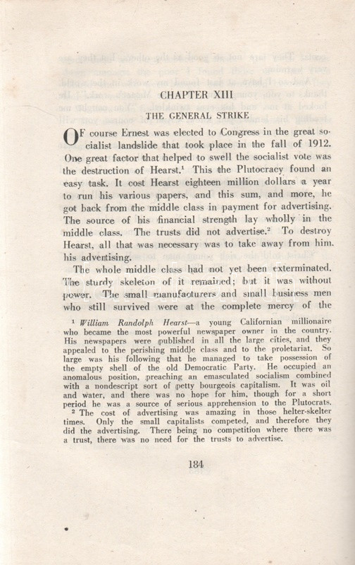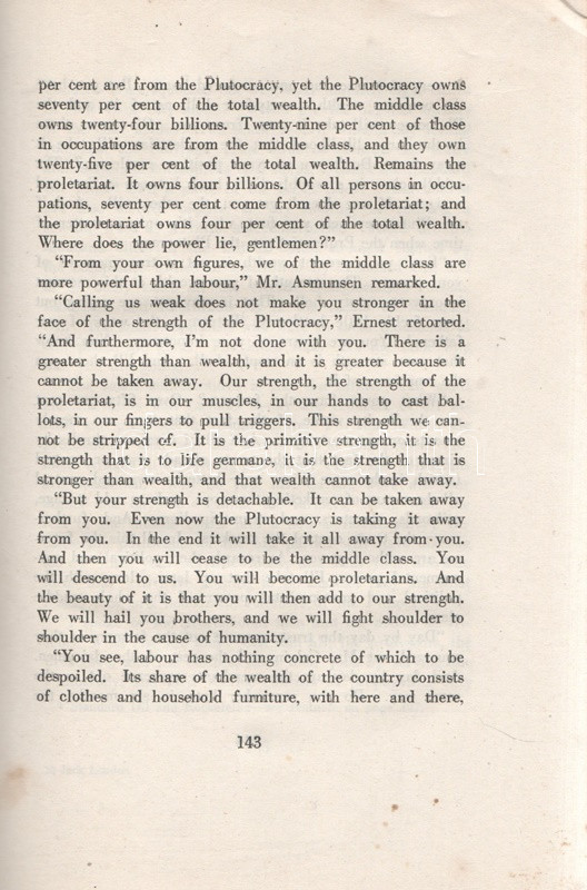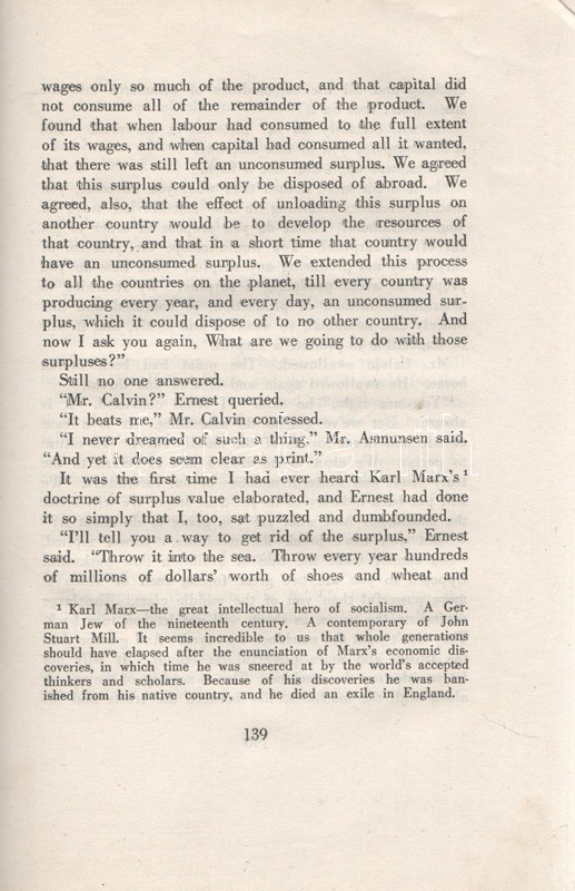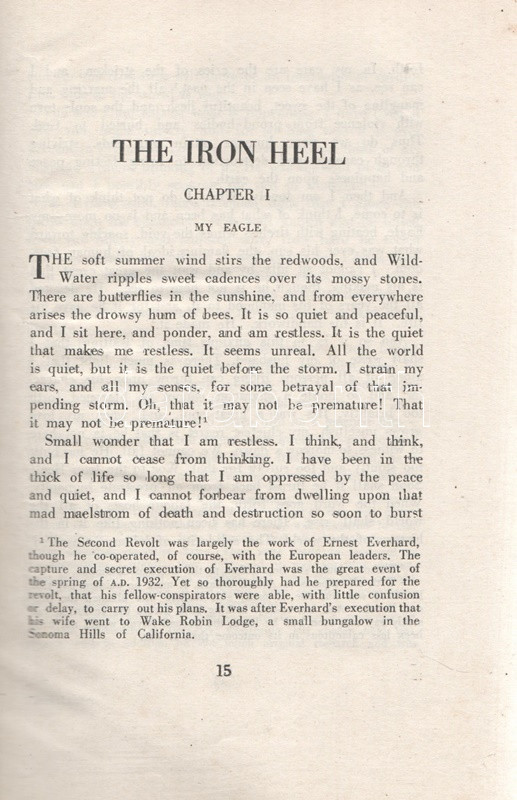 London, Jack: The Iron Heel. Moscow-Leningrad, 1934. Co-operative Publishing Society of Foreign Workers in the U. S. S. R. (Printed by Pechatny Dvor, Leningrad). [4] + 307 + [1] p. Jack London (1876-1916) amerikai író ,,The Iron Heel" (A Vaspata) című tudományos-fantasztikus regénye eredeti nyelven először 1908-ban jelent meg. A szociografikus megközelítést a sci-fi és a kalandregények ötlettárával ötvöző Jack London ebben a regényben a munkások forradalmának egy lehetséges változatát tematizálja. Szovjet kiadásunk emlékezetes adaléka Paul Vaillant-Couturier francia kommunista mozgalmár, FKP-alapító, Komszomol-munkatárs kiemelkedően leninista előszava, illetve a regény nóvumnak számító lapalji jegyzetapparátusa, amely a tudományos-fantasztikus regény megfelelően marxista olvasatát van hivatva biztosítani. Néhány oldalon apró foltosság. Feliratozott kiadói egészvászon kötésben, illusztrált kiadói védőborítóban. Jó példány.