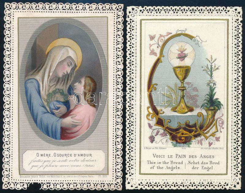 Beschreibung: cca XIX. sz utolsó harmada/Vége 2 db csipkés szentkép, kézzel színezett fametszetek, az egyik szélén kis sérülés, 11x7 cm és 12x7 cm.