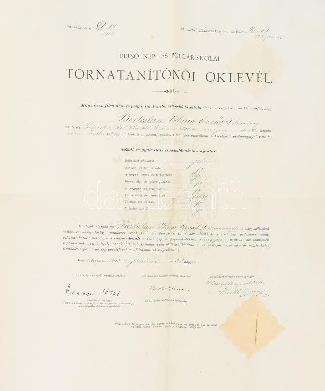 1912 Tornatanítónői oklevél, vízjeles papíron, papírfelzetes pecséttel... https://www.darabanth.com/de/470-Fernauktion/470.0/Kunst-Dokumente-andere-Sammelgebiete/Dokument~500024/1912-Tornatanitonoi-oklevel-vizjeles-papiron-papirfelzetes-pecsettel-kis-szakadassal-hajtott-~II3182860
