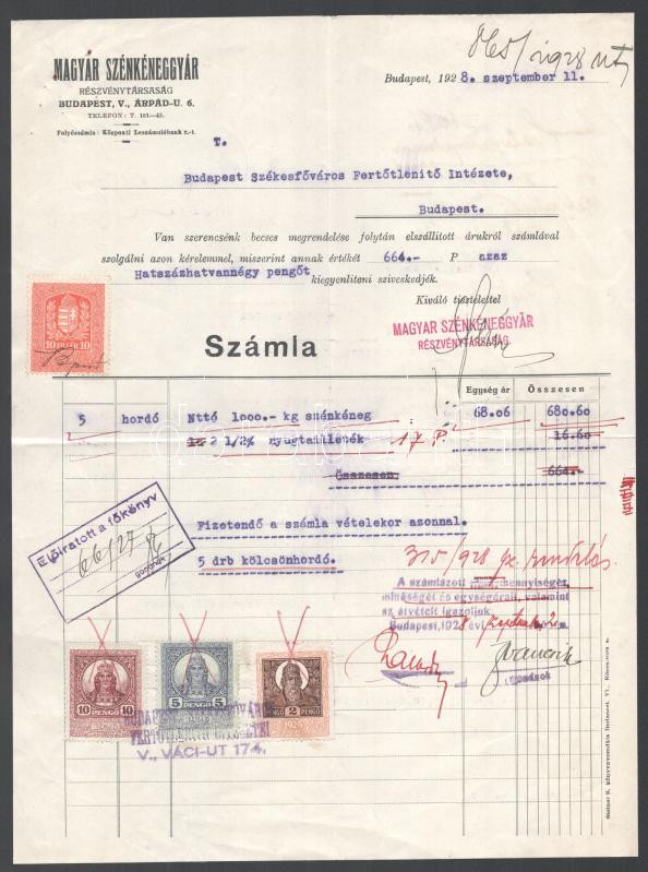 Beschreibung: 1928 Bp., Magyar Szénkéneggyár Rt. fejléces számla, Budapest Székesfőváros Fertőtlenítő Intézete részére kiállítva, okmánybélyegekkel