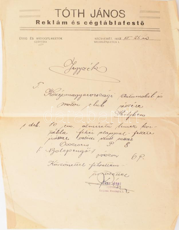 1933 Kecskemét, Tóth János reklám és cégtáblafestő fejléces számla a K... https://www.darabanth.com/de/470-Fernauktion/470.0/Kunst-Dokumente-andere-Sammelgebiete/Dokument~500024/1933-Kecskemet-Toth-Janos-reklam-es-cegtablafesto-fejleces-szamla-a-Kozepmagyarorszagi-Automobil~II3168120
