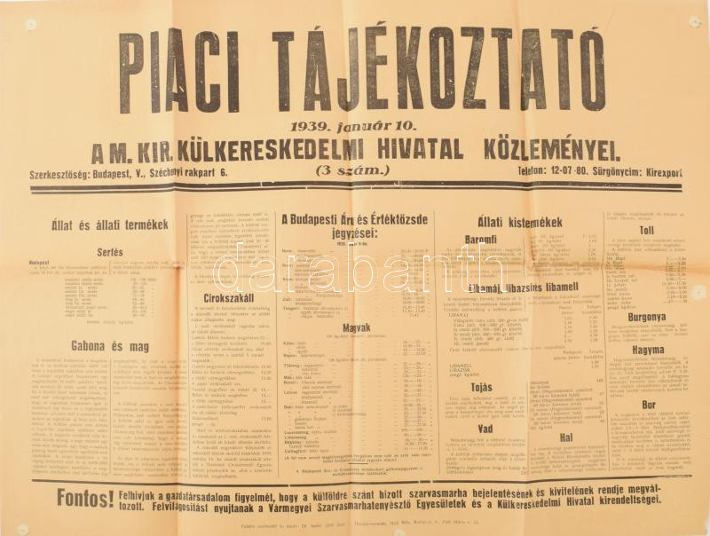 Beschreibung: 1932 Piaci tájékoztató. Az m. kir külkereskedelmi hivatal közleményei tőzsdei és egyéb kereskedelmi információk plakáton 65x47 cm