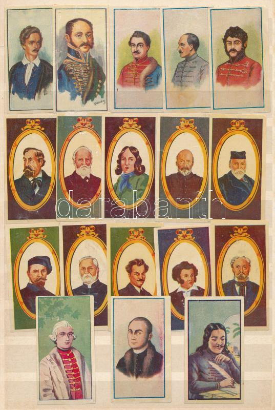 cca 1930-1940 Magyar történelmi személyeket, költőket, írókat, művészeket ábrázoló gyűjtőképek, össz. 18 db, a Szent István Cikóriagyár "Képes magyar történelem, irodalom és művészet" albumából, a képek hátoldalán leírással