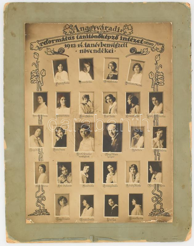 1914 A nagyváradi református tanítóképző intézet 1913/14. tanévben végzett növendékei, nagyméretű tablófotó, sérült, kissé foltos, 38x27,5 cm (teljes méret: 46x35,5 cm)