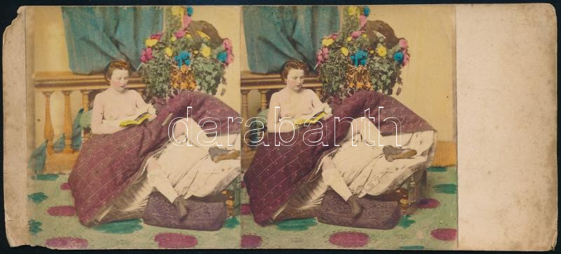 Beschreibung: cca 1870-1880 Könyvet olvasó hölgy, finom erotikus sztereófotó, kézzel színezett, 8,5×19 cm