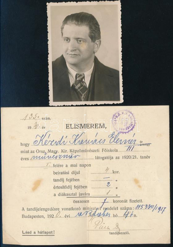 Beschreibung: cca 1940 Kézdi-Kovács Elemér (1898-1976) festőművész portréja, Kézdi-Kovács László (1864-1942) festőművész, műkritikus fia; jelzés nélküli, hátoldalán nevesített fotó, 9x6 cm + 1920 Kézdi-Kovács Elemér részére kiállított elismervény tandíjfizetésről, Képzőművészeti Főiskola