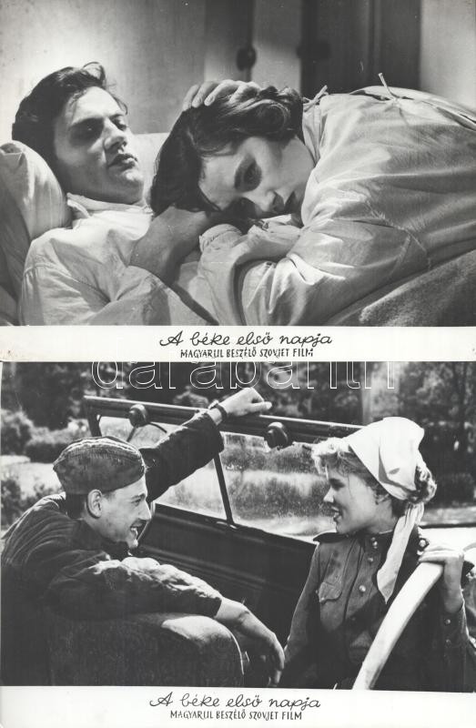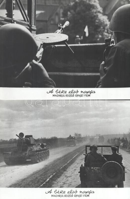 cca 1989 előtt készült ,,A béke első napja" című szovjet film jelenetei és szereplői, 11 db vintage produkciós filmfotó (vitrinfotó, lobbyfotó) ezüst zselatinos fotópapíron, a használatból eredő (esetleges) kisebb hibákkal, 18x24 cm