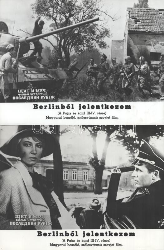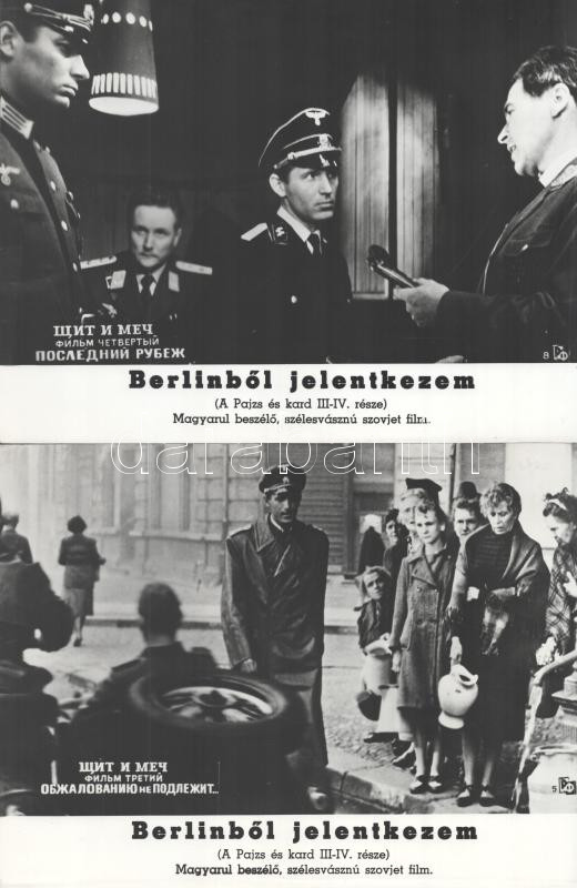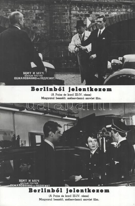 cca 1989 előtt készült ,,Pajzs és kard - Berlinből jelentkezem" című szovjet film jelenetei és szereplői, 9 db vintage produkciós filmfotó (vitrinfotó, lobbyfotó) ezüst zselatinos fotópapíron, a használatból eredő (esetleges) kisebb hibákkal, 18x24 cm