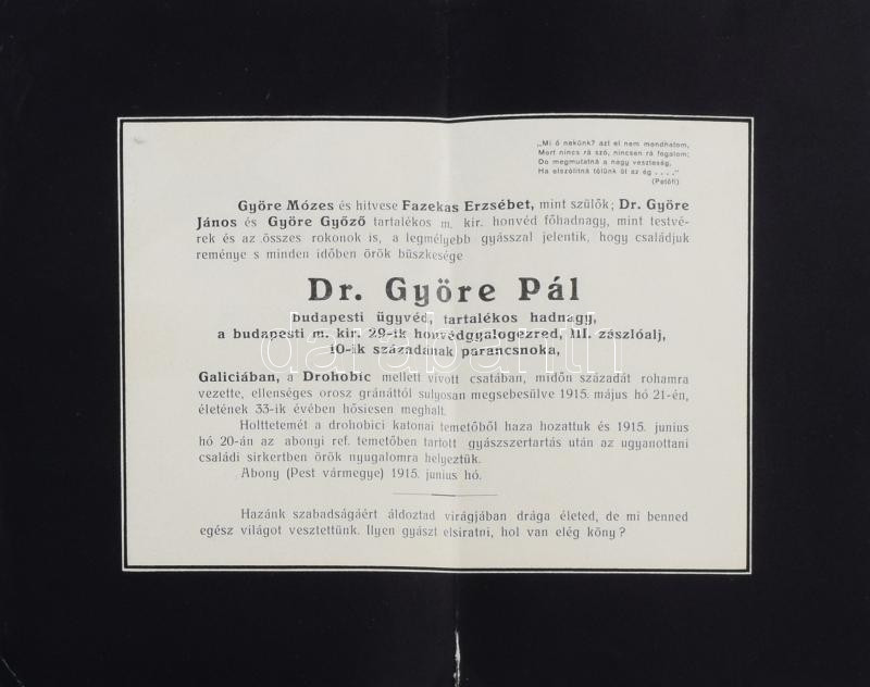 1915 Abony, Dr. Györe Pál ügyvéd, tartalékos hadnagy, a budapesti m. kir. 29-ik honvédgyalogezred III. zlj. 10-ik századának parancsnoka gyászjelentése, kis szakadással