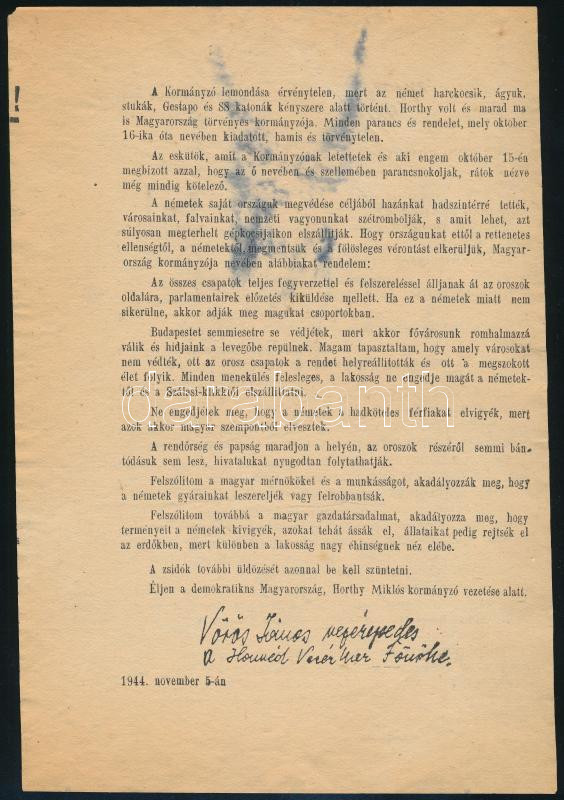 1944.nov. 5., "A kormányzó lemondása érvénytelen (...)", Vörös János vezérezredes II. világháborús németellenes, Horthy Miklós mellett kiálló kétoldalas röplapja, sokszorosított aláírásával, mindkét oldalon ugyanazon szöveggel, 24x16 cm