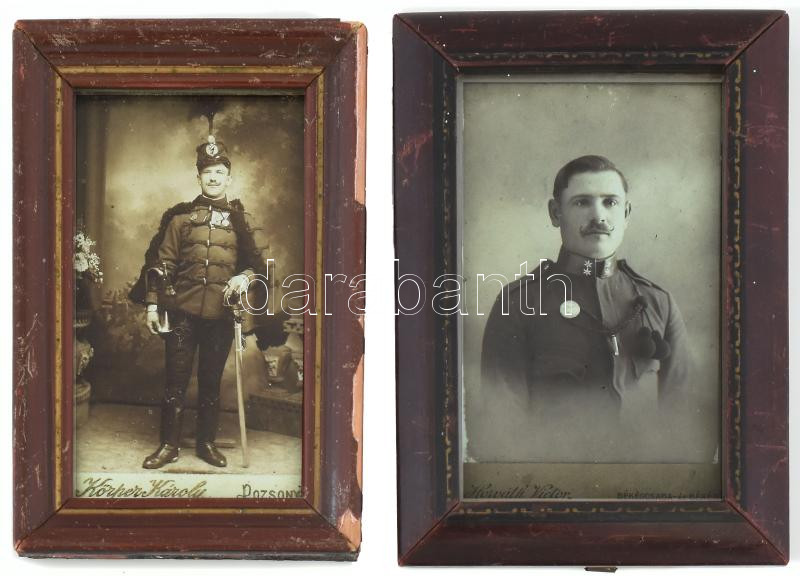 cca 1914-1918, 2 darab katona fotó, közte trombitás huszár fotójával, Körper Károly pozsonyi és Horváth Victor békéscsabai műhelyéből, üvegezett keretekben, cca 11x7 cm