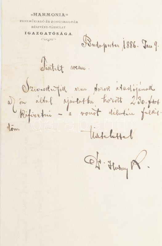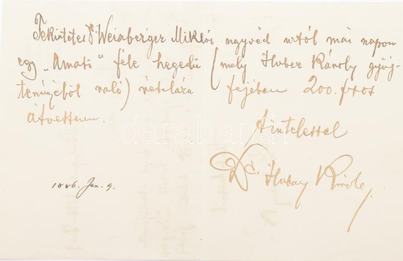 1886 Bp., Dr. Hubay Károly (1853-1896) ügyvéd, zenetörténész, a Harmonia Zeneműkiadó és Zongoragyár Rt. igazgatójának autográf aláírása és sorai, vonóért fizetendő összeg tárgyában, illetve nyugta Weisberger Miklós ügyvéd részére, Huber Károly (1828-1885) hegedűművész, karmester, zeneszerző gyűjteményéből származó Amati hegedű vételára fejében átvett összegről, ,,Harmonia" Zeneműkiadó és Zongoragyár fejléces papíron