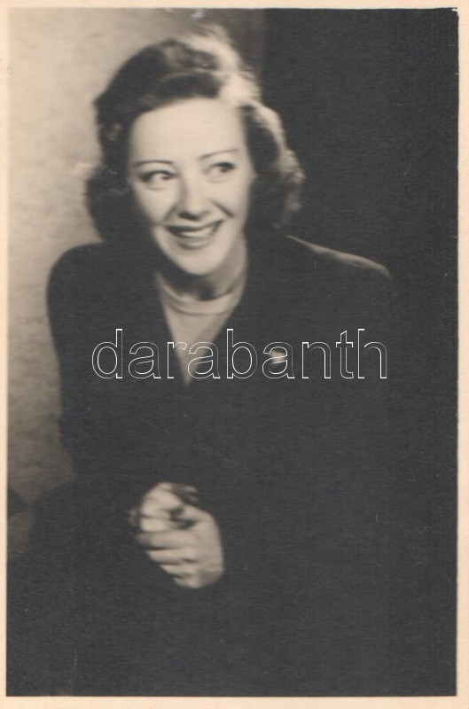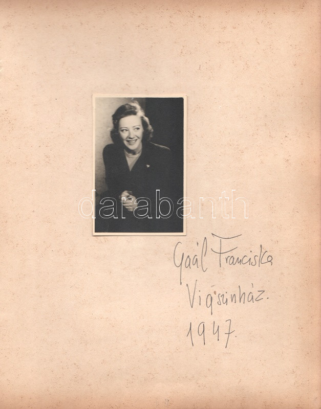 Gaál Franciska (1903-1972) színésznő, elsősorban az 1945 előtti évek népszerű naivája autográf aláírása egy 245x190 mm-es papírlapon, felragasztott, 83x55 mm-es eredeti fényképe mellett: ,,Gaál Franciska, Vígszínház 1947." Gaál Franciska 1946-ban még szerepelt a Vígszínház Claudia című darabjában, de 1947-ben férjével végleg Amerikába költözött.