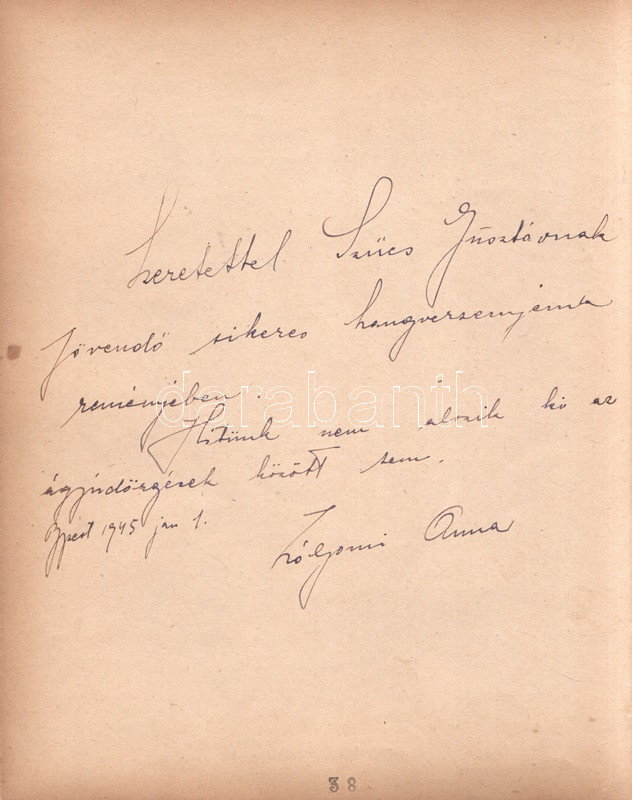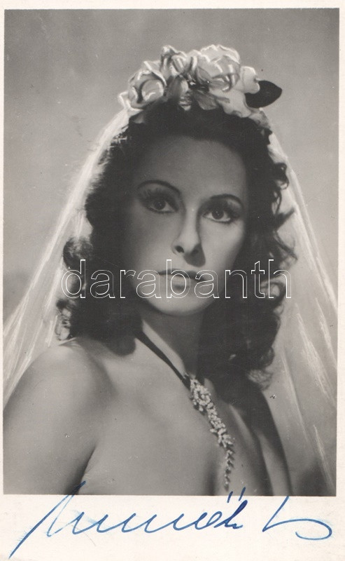 Muráti Lili (1911-2003) magyar színésznő és írónő aláírt fényképe. Inkey Tibor felvétele, mérete: 137x85 mm, egy 245x190 mm-es kartonlapra ragasztva. A kartonlap hátoldalán Zólyomi Anna (?) autográf, Szűcs Gusztáv (1893-1967) nótaszerzőnek szóló, Budapesten, 1945. január 1-én kelt dedikáló sorai.