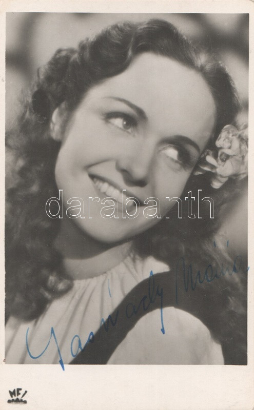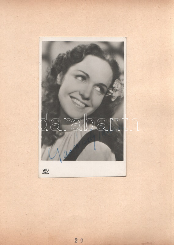 Tasnády Fekete Mária (1911-2001) színésznő, szépségkirálynő, Radványi Géza filmrendező felesége, Márai Sándor író sógornője, aláírt, fiatalkori fényképe. Mérete: 135x85 mm, egy 245x173 mm-es kartonlapra ragasztva.