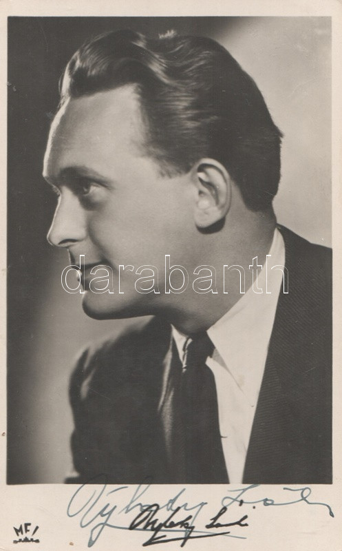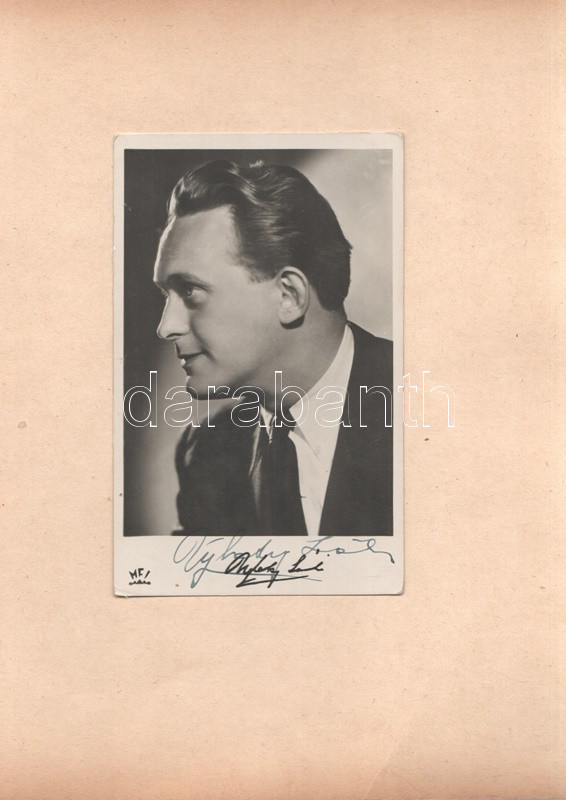 Ujlaky László (1914-1994) színész [ifj. Ujlaky László (1942-2018) Jászai Mari-díjas színész édesapja] aláírt fiatalkori fényképe. Mérete: 140x90 mm, egy 245x175 mm-es kartonlapra ragasztva.