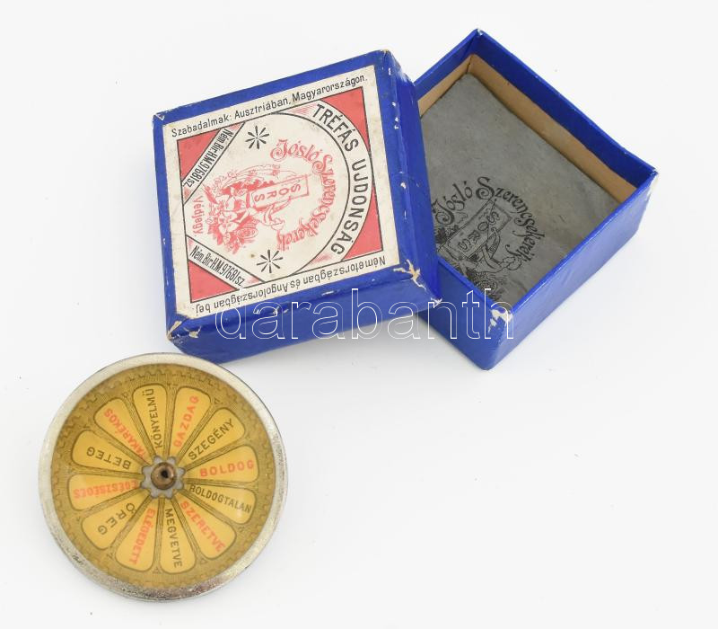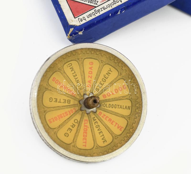 ,,Tréfás Ujdonság - Jósló Szerencsekerék" (szabadalom: Ném. Bir. H. M. 97681 sz.), régi golyós pörgettyű játék, útmutatóval (szakadt), eredeti dobozában, d: 4,7 cm