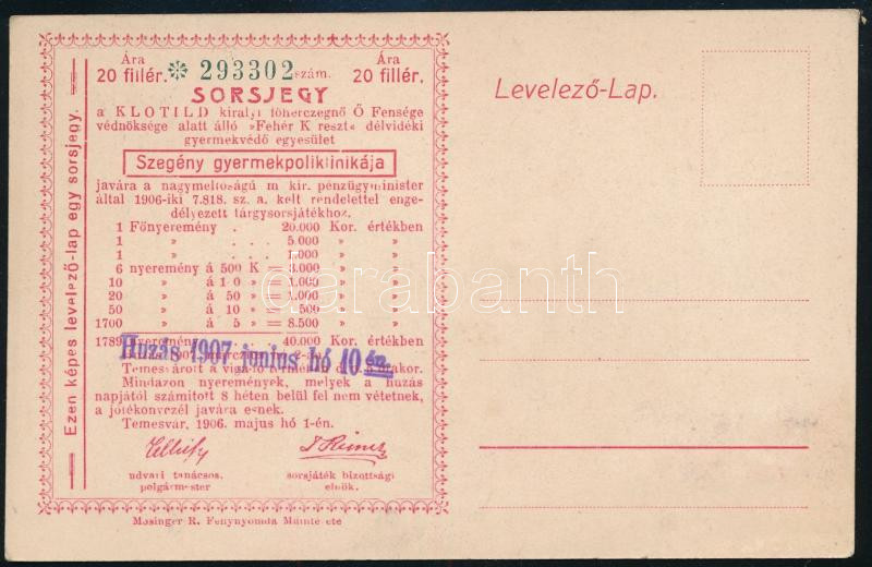 1907 Sorsjegy a Klotild ki.r főhercegnő Ő Fensége védnöksége alatt álló "Fehér Kereszt" délvidéki gyermekvédő egyesület Szegény Gyermekpoliklionikája javára, húzás Temesvárott, számozott képes levelezőlap, 9x14 cm