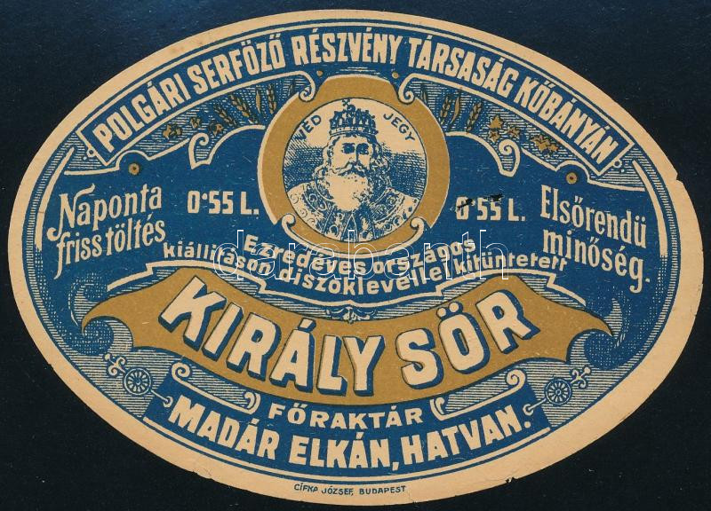 Beschreibung: Polgári Serfőző Részvénytársaság Kőbányán Király Sör, Főraktár Madár Elkán Hatvan sörcímke