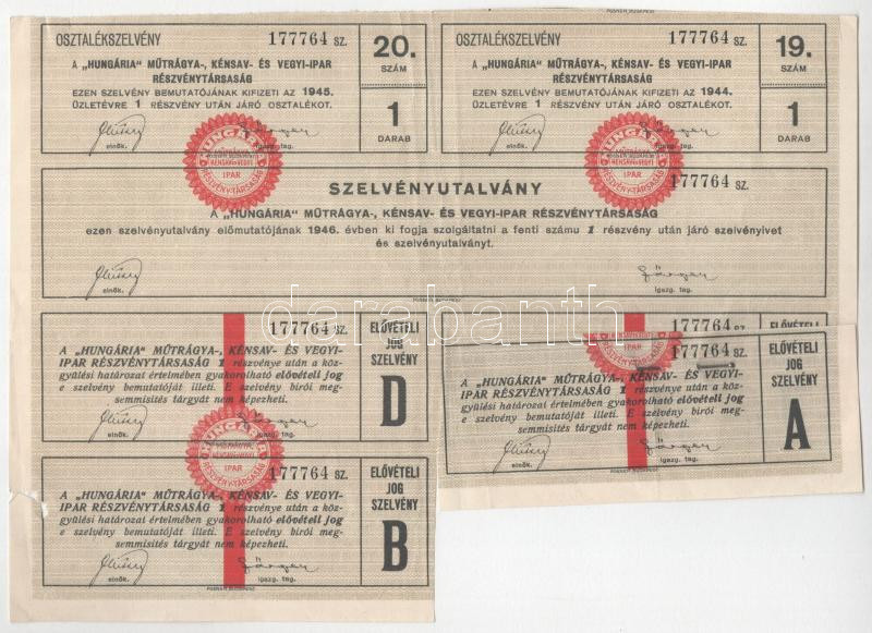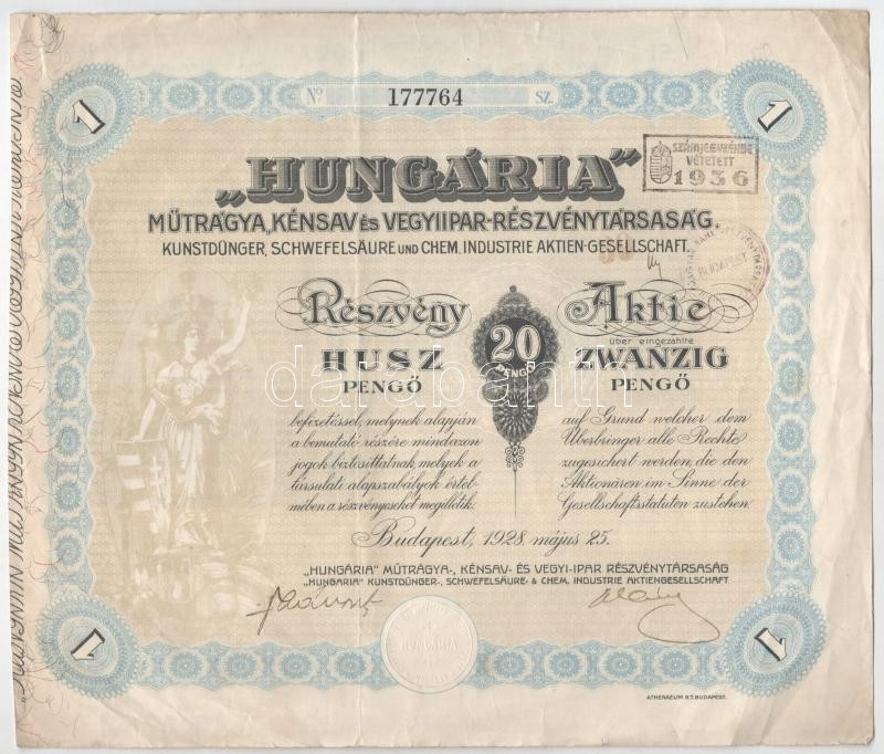 Budapest 1928. " 'Hungária' Műtrágya, Kénsav és Vegyiipar-Részvénytárs... https://www.darabanth.com/de/470-Fernauktion/470.0/Numismatik/Aktien-und-Tickets~1500006/Budapest-1928-Hungaria-Mutragya-Kensav-es-Vegyiipar-Reszvenytarsasag-reszvenye-20P-rol~II3179492
