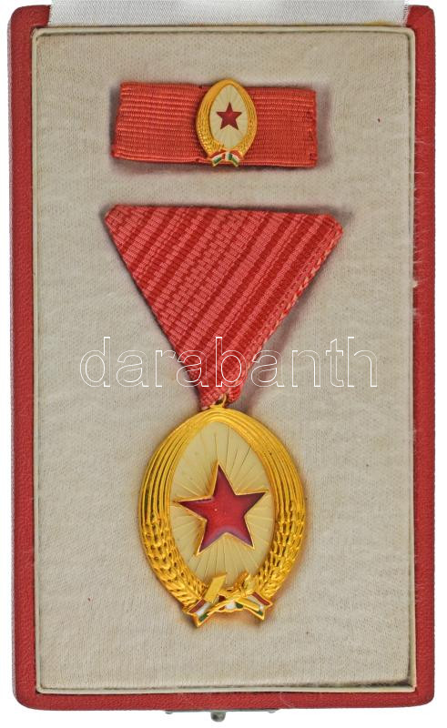 Beschreibung: 1964. "Munka Érdemrend" arany fokozata, műgyantás bronz kitüntetés mellszalagon, szalagsáv miniatűrrel, eredeti tokban T:AU,XF