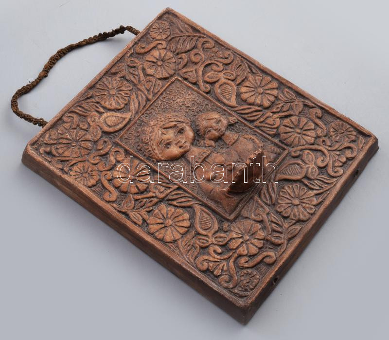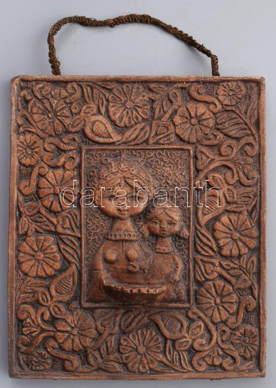Beschreibung: Kovács Mária: Anya kislányával díszítéssel fali mécsestartó. Engóbozott kerámia, jelzés nélkül, 21x17 cm