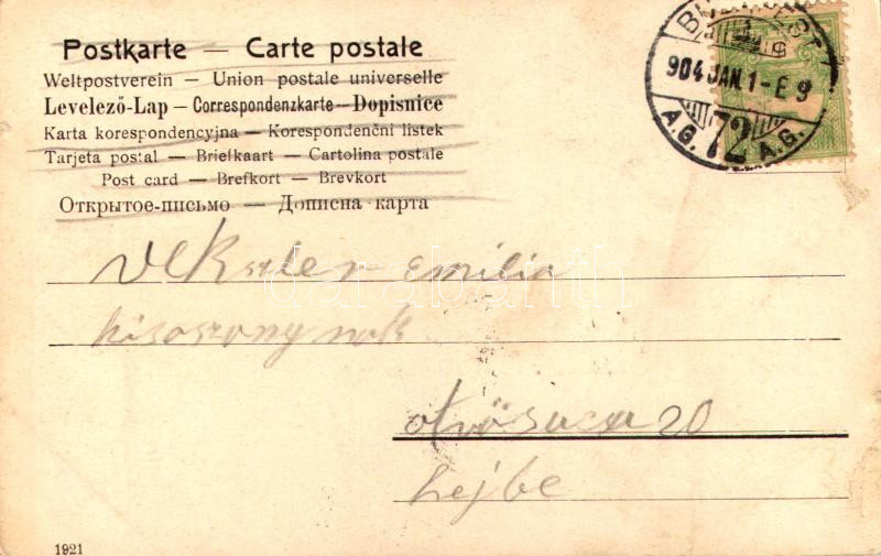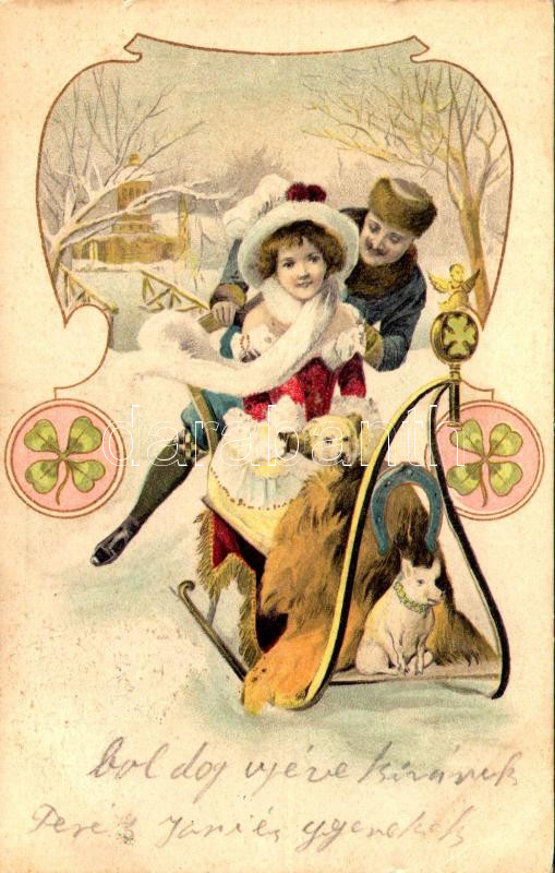 1904 Boldog Újévet / New Year greeting art postcard with romantic coup... https://www.darabanth.com/de/471-Fernauktion/471.0/Ansichtskarten/GruC39Fkarten-Feste~2000085/1904-Boldog-Ujevet-New-Year-greeting-art-postcard-with-romantic-couple-sled-clovers-and-pig-A~II3185124