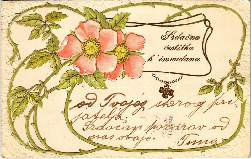 Beschreibung: 1906 Srdacna cestitka k' imendanu / Szecessziós dombornyomott születésnapi üdvözlet / Birthday, Art Nouveau, embossed greeting (fa)