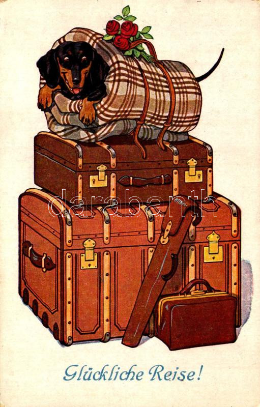 Glückliche Reise! / Dachshund dog traveling (EK) https://www.darabanth.com/de/471-Fernauktion/471.0/Ansichtskarten/Hunde~2000044/Gluckliche-Reise-Dachshund-dog-traveling-EK~II3192154