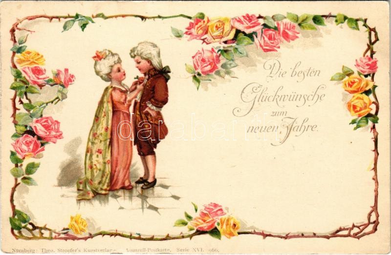 Beschreibung: Die besten Glückwünsche zum neuen Jahre / Gyerekek / Children. Theo. Stroefer's Kunstverlag Aquarell-Postkarte Serie XVI. Nr. 966. floral litho