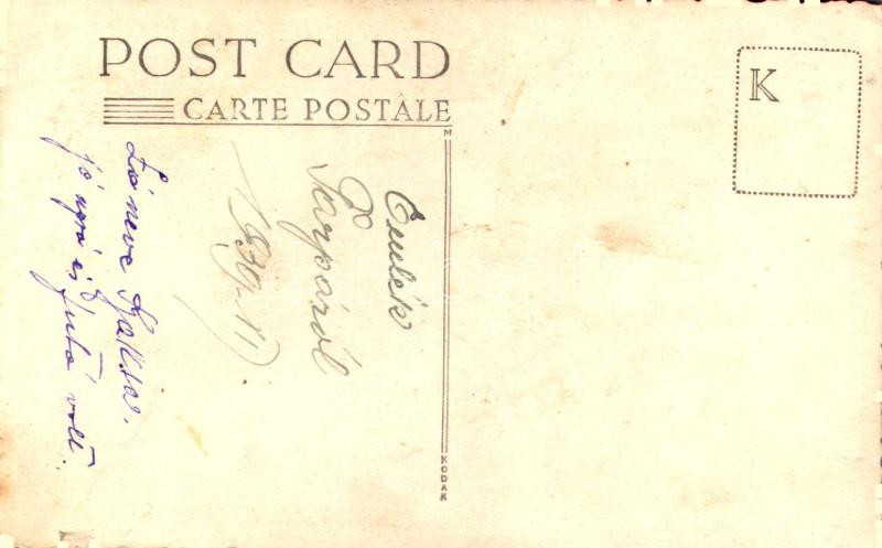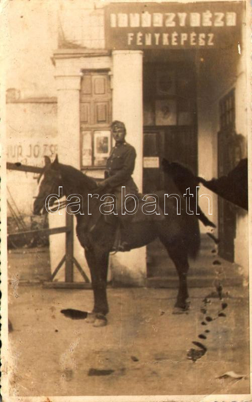 1930 Magyar katona lóháton, Ignáczy Géza fényképész üzlete előtt / Hungarian military, soldier with horse in front of the photographer's atelier. photo (kis szakadás / small tear)